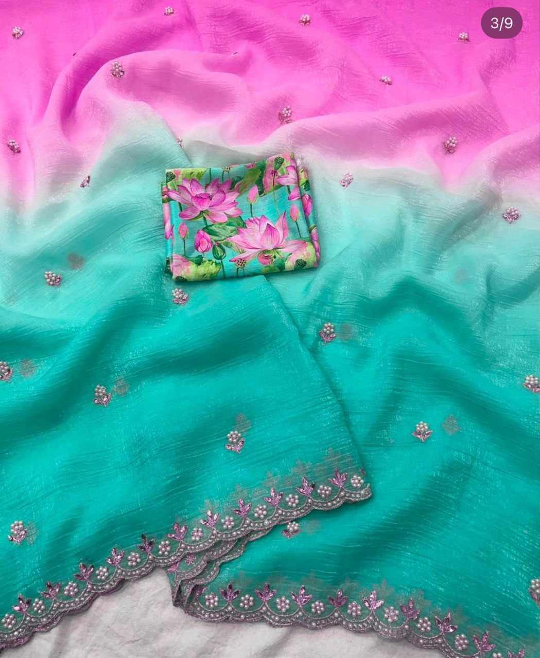 Fabric:- Candy Crush Silk With Beautiful Embroidery& Moti Work Scalloped Cut work Border